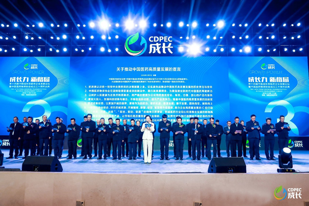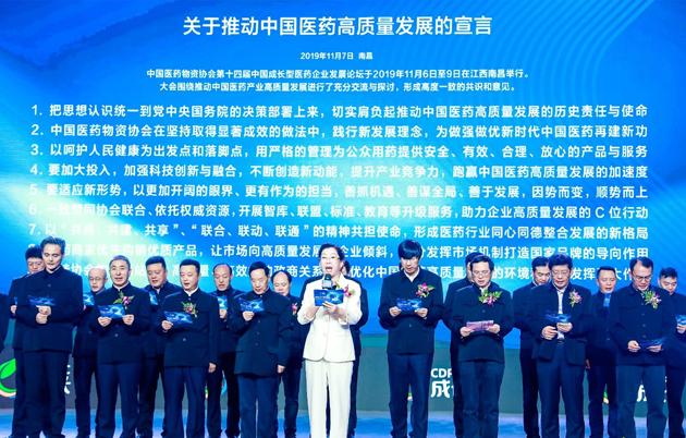 推动中国医药高质量发展,是第十四届中国成长型医药企业发展论坛的中心任务,通过充分交流与探讨,形成高度一致的共识和意见。大会开幕式上,40位男企业家同着中山装闪亮登场,在中国医药物资协会副会长、葫芦娃药业集团董事长刘景萍女士的领读下,共同隆重发布《关于推动中国医药高质量发展的宣言》,充分彰显了中国医药企业努力推动医药产业高质量发展的无比自信、坚定信念和磅礴力量。