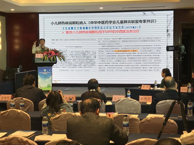 ▲中华中医药学会儿科分会副主任委员、成都中医药大学常克教授在学术大会上解析小儿肺热咳喘颗粒