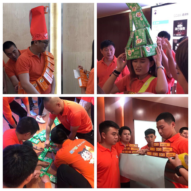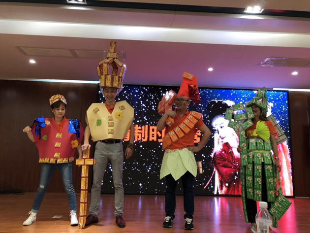 在营销将士们的巧手下,新产品肠炎宁颗粒的样盒被做成了长裙,无糖夏桑菊颗粒的样盒被做成了皇冠和宝剑,而小儿肺热的样盒则被做成飘带、阳伞和背包。当三组选手穿着产品样盒做成的时装上台走秀时,全场沸腾,培训会的气氛达到了高潮!所有在场的人员,都通过全员参与设计这场活泼生动的时装表演,对新品留下了深刻的印象。同时,OTC营销将士群策群力,在短时间内策划出这场活动,体现了葫芦娃人超强的凝聚力、执行力及战斗力。