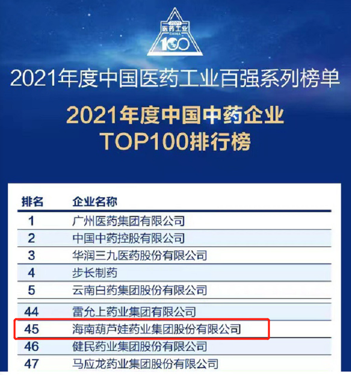 喜讯!葫芦娃药业连续3年荣登“中国中药企业TOP100排行榜”