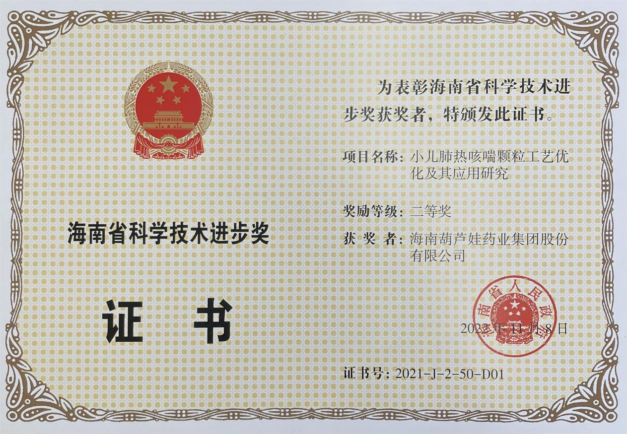 为此,小儿肺热咳喘颗粒的制备方法获得了第二十一届中国专利优秀奖(2019年),专利申请号:ZL201010134951,此次作为专利技术的应用,获得了2021年度海南省科学技术进步奖二等奖。在此之前,葫芦娃牌小儿肺热咳喘颗粒还多次被授予“临床价值中成药品牌”、“中国连锁药店最具合作价值单品”,荣登“中国医药品牌榜”。