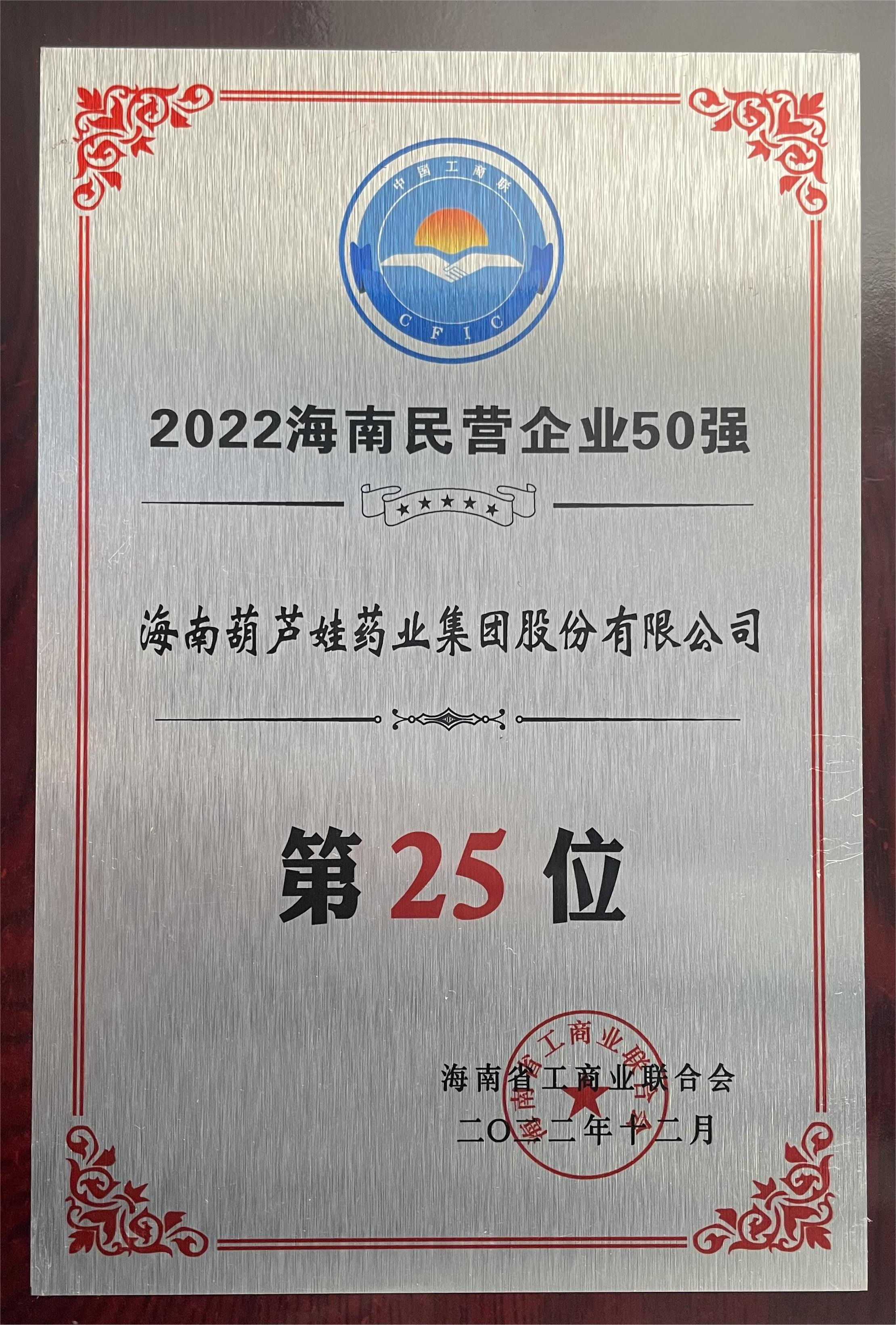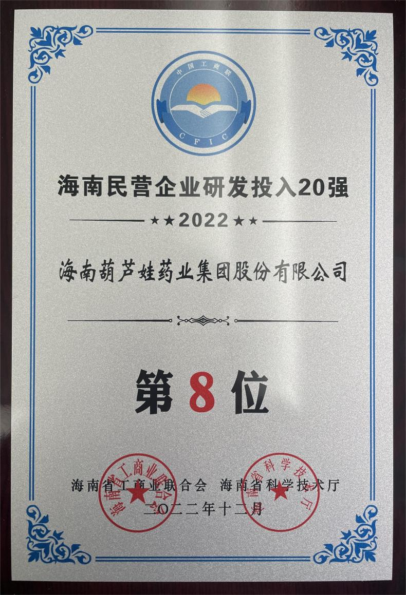 12月23日,2022海南民营企业50强和研发投入20强发布会在海口举行。会上发布了“2022海南民营企业50强”“2022海南民营企业研发投入20强”榜单和分析报告。葫芦娃药业再次荣登两榜,在海南民营企业50强榜单中位列第25位,较去年上升8位,这也是公司连续三年登榜;在海南民营企业研发投入20强中位列第8位,较去年上升7位。