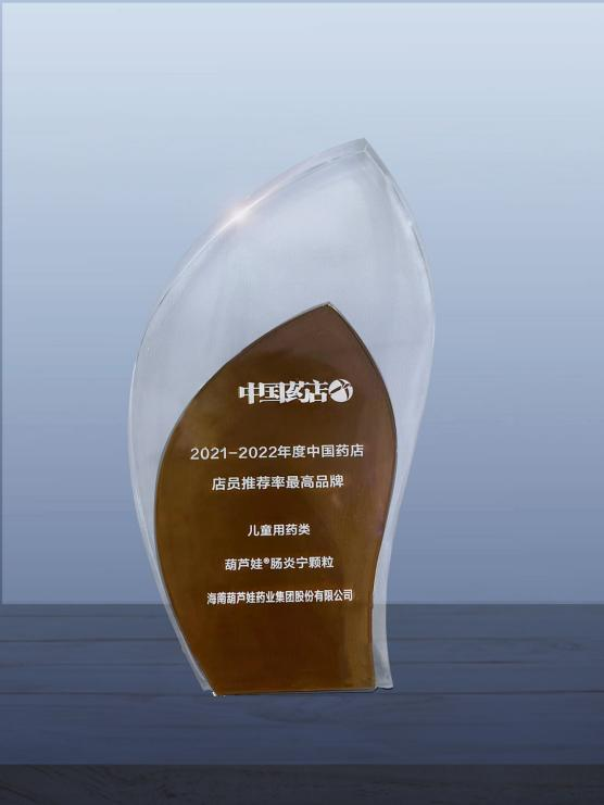 近日,由《中国药店》杂志社举办的“2022~2023年度中国药店发展报告暨中国药店价值榜发布会”在青岛举行,会上发布了“2021-2022年度中国药店店员推荐率最高品牌”奖,葫芦娃药业两大明星产品葫芦娃牌小儿肺热咳喘颗粒(4g)、葫芦娃牌肠炎宁颗粒(2g)双双上榜。