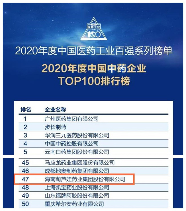 葫芦娃药业荣登“中国中药企业TOP100排行榜”第47位
