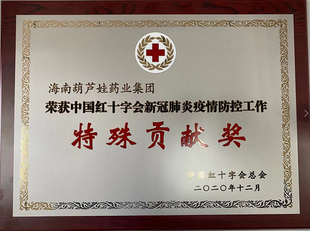 日前,中国红十字会对抗击新冠疫情作出突出贡献的先进集体、先进个人和优秀志愿者进行表彰,海南葫芦娃药业集团股份有限公司荣获“中国红十字会新冠疫情防控工作特殊贡献奖”!