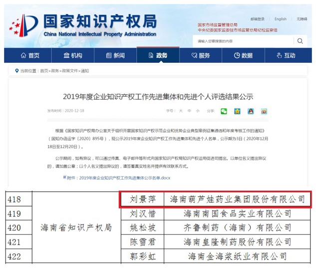 近日,国家知识产权局公布了“2019年度企业知识产权工作先进集体和先进个人”评选结果,葫芦娃药业集团董事长刘景萍女士凭借近年来在企业知识产权管理方面的突出表现,被评为“2019年度企业知识产权工作先进个人”。