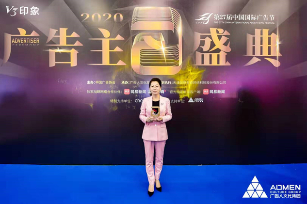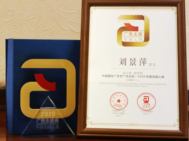 2020年11月16日,第27届中国国际广告节广告主盛典在厦门国际会展中心隆重举行,凭借卓越的品牌营销策略和系统的品牌管理能力,葫芦娃药业集团董事长刘景萍女士获得“中国国际广告节广告主奖•2020年度功勋人物”荣誉称号。