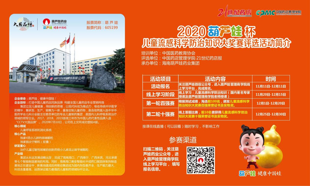 据世界卫生组织WHO统计,每年有5%~10%的成年人、20%~30%的儿童罹患流感,有300万~500万重症患者,造成25万~50万人死亡,儿童是流感的高发人群及重症病例的高危人群。尤其是在当下全球疫情肆虐之季,新冠防控工作依然不容放松,流感防治知识科普显得尤为重要。儿童是祖国的希望,民族的未来,关爱儿童健康成长是时代赋予我们的历史使命,为了能帮助更多的儿童科学防治流感、科学预防新冠肺炎,葫芦娃药业集团携手中国医药教育协会药店管理专业委员会(药店管理学院)和21世纪药店报特举办本次儿童流感科学防治知识大奖赛。