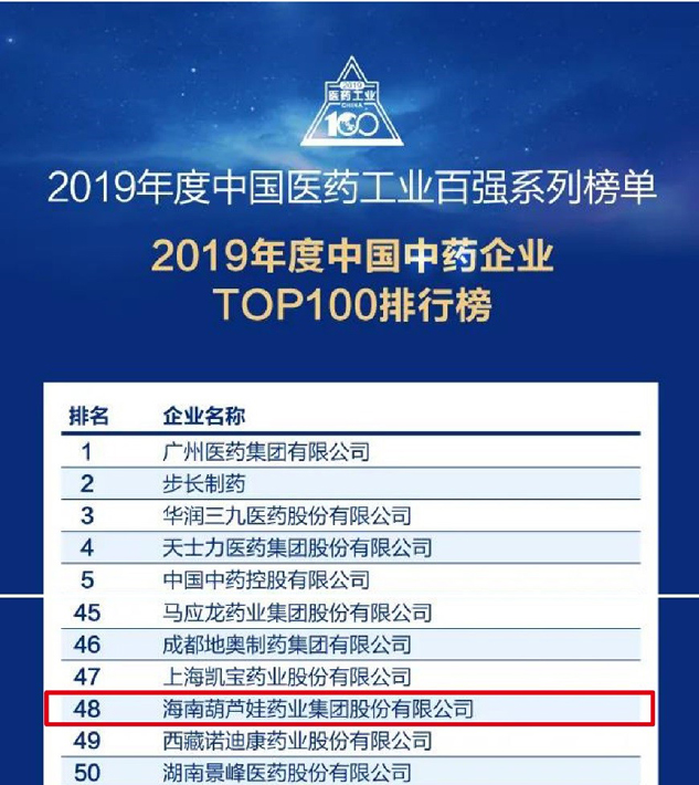 海南葫芦娃药业集团股份有限公司凭借扎实的研发生产实力和稳健的市场推广能力,成功入选“2019年度中国医药工业百强系列榜单”子榜单“2019年度中国中药企业TOP100排行榜”,在短短一年时间内,从2018年度的中国中药企业第63名跃升至第48名。